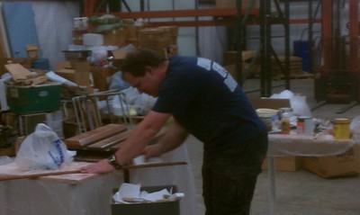 The back door had to be carefully restored. Ralph did the wood repair work and Andrew is doing the finish work. See firefighters do all kinds of good things.