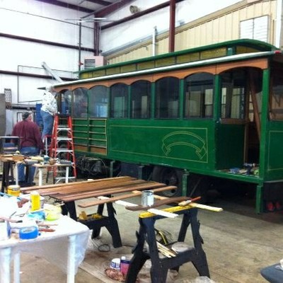 As we work our way around the exterior, we begin to appreciate how much character the mahogany adds to the trolley overall. After removing the skirt wood and the middle wood, the whole trolley looks like a porcupine. All the pop rivets that held the wood on are sticking out of the skin. A crew clips the rivets and punches them back through the outer skin. I know... TMI...