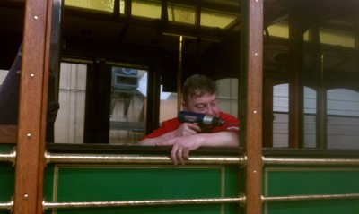 Look! Woody is drilling holes in that beautifully finished wood post!! Well..... actually he is down crawling under the seats drilling holes in the floor to mount the benches that will allow us to seat four more passengers when the handicapped spaces are not needed. He came up for air and posed so you would think he was working. (He really was working hard. See the flushed face?) Now you know the rest of the story.